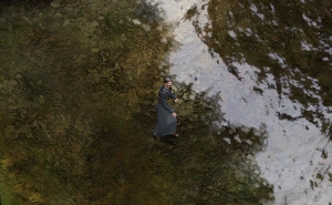 He can be found standing outside the temple.